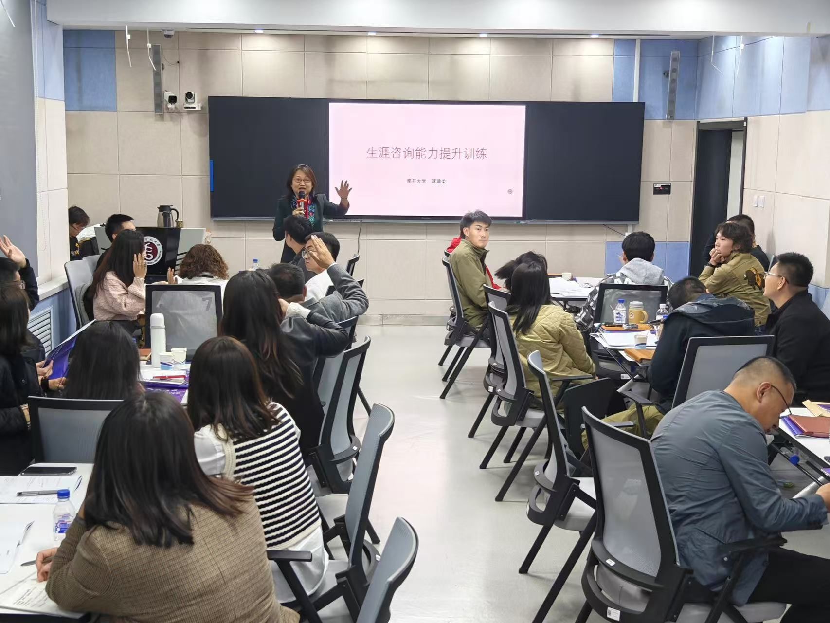 培训会特邀南开大学青年研究中心主任、教育部就业创业专家、教育部大学生职业发展与就业指导课程特聘专家、大学生幸福讲堂发起人蒋建荣作报告。蒋建荣从生涯咨询师能力概览、生涯咨询流程、经典理论视角下的生涯咨询等三个方面进行了辅导培训,通过体验式、研讨式和案例分析式相结合的教学手段,帮助老师们快速掌握生涯咨询和就业指导的工作方法。